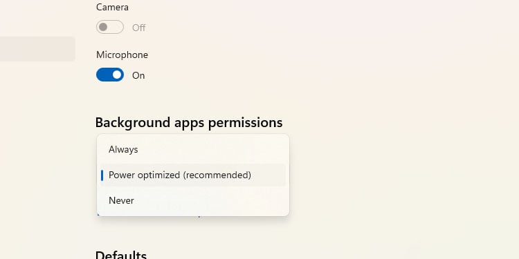 Vá para Permissões de aplicativos em segundo plano. Dê permissão selecionando “Sempre“ou “Energia otimizada.“Além disso, ative o microfone e a câmera.