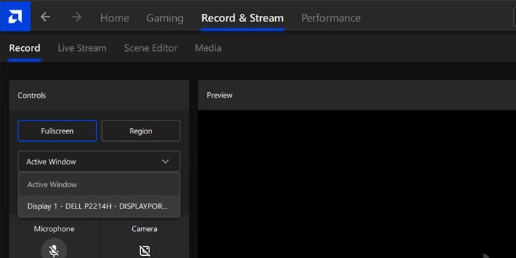 Abra o AMD Adrenalin.Vá para Gravar e transmitir.Selecione para gravar a janela ativa, a tela inteira ou uma região.