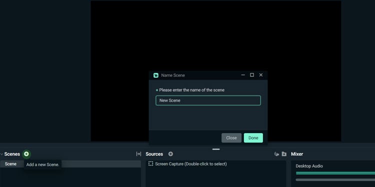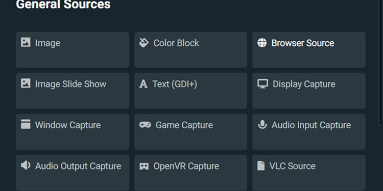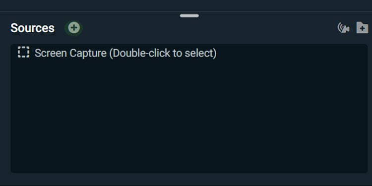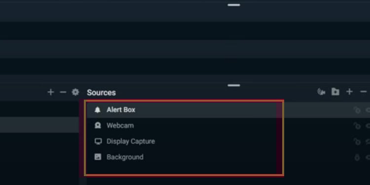 Em seguida, clique no botão de adição em Fontes para começar a adicionar elementos à sua cena. Você pode mover e redimensionar qualquer coisa que adicionar à cena.