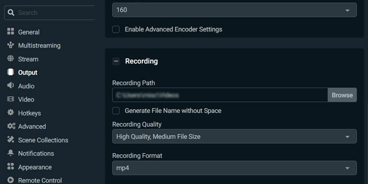 Por fim, verifique as configurações de streaming/gravação para opções extras. Essas opções giram em torno da qualidade de áudio e vídeo.