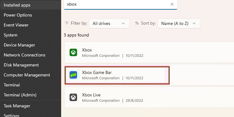 Pressione a tecla do Windows mais “X“em seu teclado. No menu em cascata, clique em “Aplicativos e recursos.”Procure por “Barra de jogos do Xbox.”