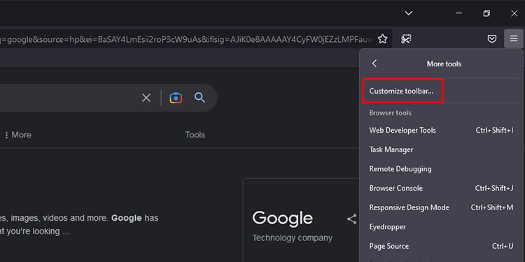 Selecione Mais ferramentas > Personalizar barra de ferramentas.