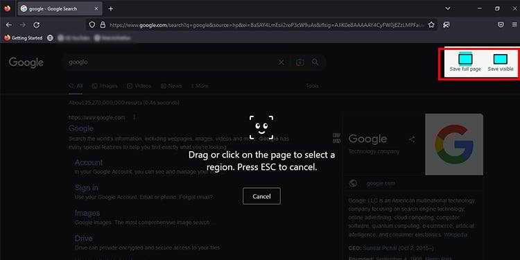 Como o Edge, o Firefox também oferece o recurso de tirar uma captura de tela de rolagem. Como o edge, você também pode tirar screenshots de rolagem de apenas uma área específica da página. Você precisará selecionar Salvar página inteira para capturar a página da web.