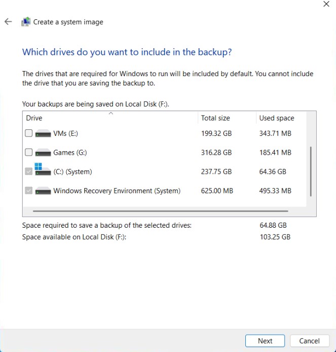 Uma observação rápida: você pode forçar o Backup de imagem do sistema a fazer backup de arquivos em outras unidades, mas não é recomendável economizar espaço e tempo.
