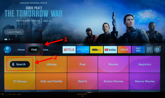 Na tela”Início“, clique na lupa em a seção superior direita.Procure por”Downloader.”