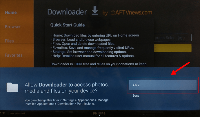 Depois de instalado e iniciado, selecione “Permitir” para permitir que o aplicativo tenha acesso às fotos , mídia e arquivos em seu dispositivo Fire Stick.