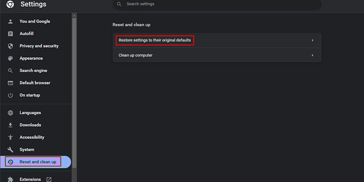 Abra o Google Chrome. Selecione o menu de três pontos e selecione Configurações. Na barra lateral, vá para Redefinir e limpar > Redefinir as configurações para os padrões originais.