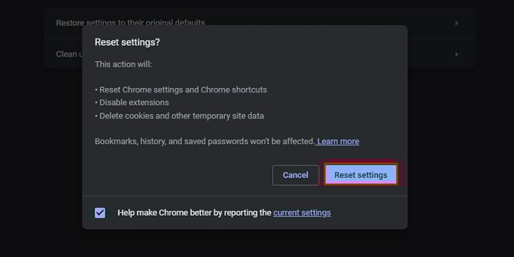 Clique em Restaurar configurações para seus valores padrão. Confirme esta ação selecionando Redefinir.