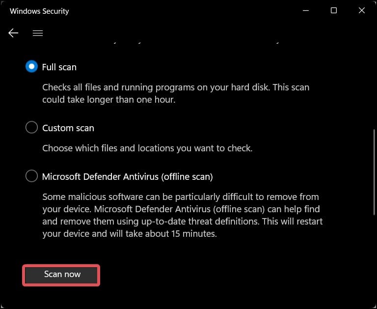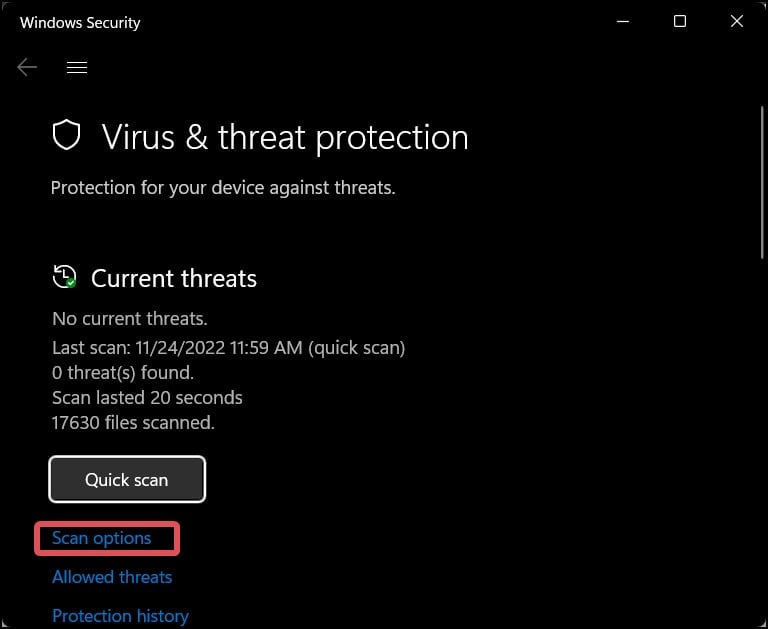 Pressione a tecla Windows + R, digite windowsdefender://threat/e pressione enter. Navegue usando o teclado e vá para Opções de digitalização.