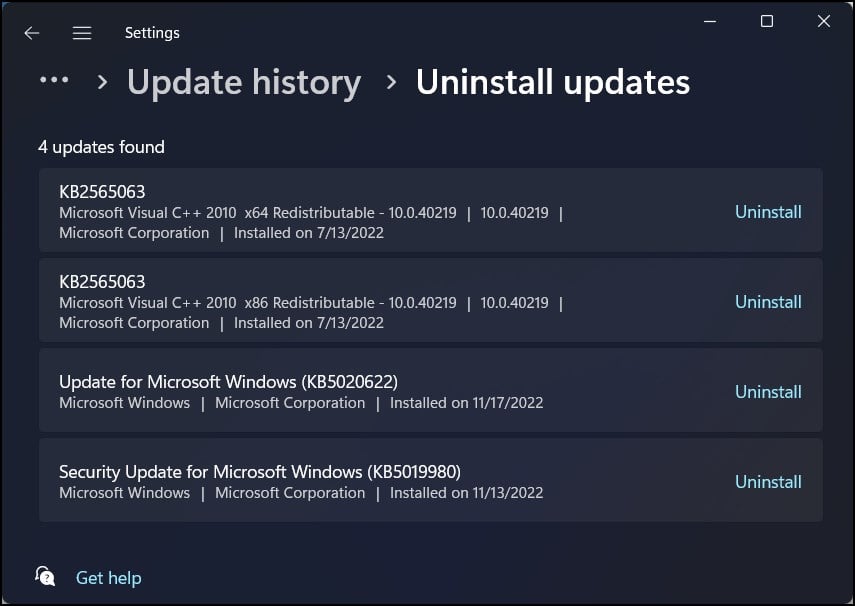 Encontre a atualização instalada recentemente e clique em Desinstalar.