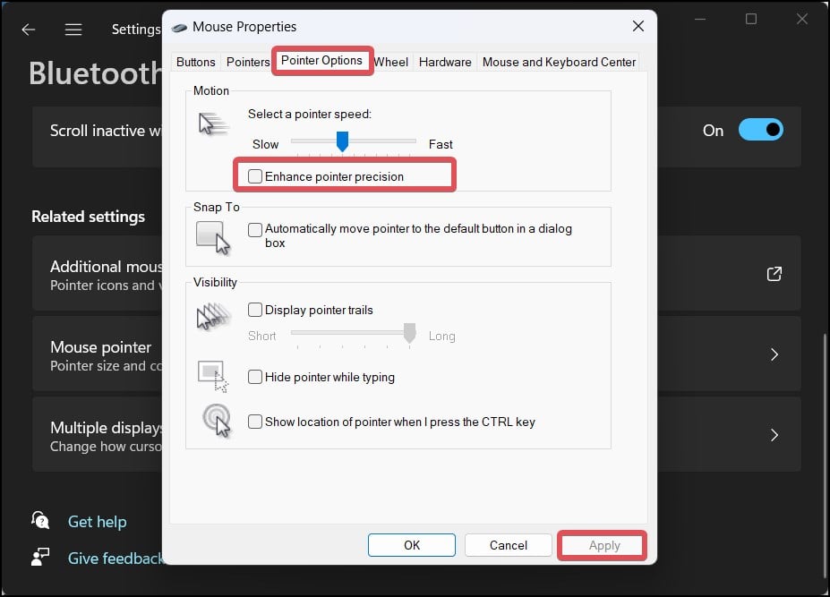 Na seção Motion, desmarque Enhance pointer opção de precisão. Selecione Aplicar para salvar as alterações.