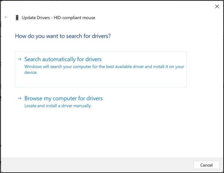 Selecione Pesquisar drivers automaticamente e siga as instruções para atualizar os drivers do mouse.