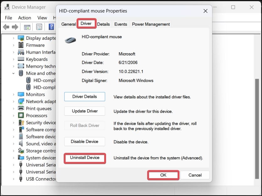 Selecione o driver do mouse que deseja reinstalar e pressione enter. Vá para a guia Driver e selecione Desinstalar dispositivo.