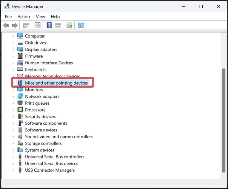 Vá para Gerenciador de dispositivos. Use o teclado para navegar até Ratos e outros dispositivos apontadores e pressione a tecla de seta para a direita para expandir a lista.