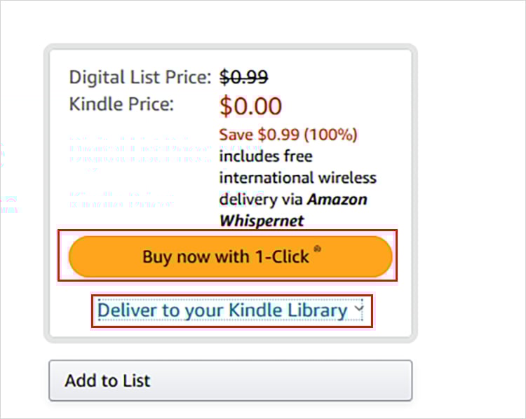 Você pode inserir o nome de seu livro preferido na barra de pesquisa ou navegar pelas listas. Abra o Livro. (Você precisa ter certeza de que o livro está no formato Kindle) Escolha Entregar para sua biblioteca Kindle. Em seguida, clique no botão Comprar agora .