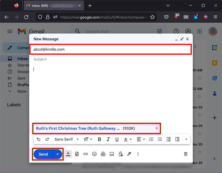 No campo Para, digite seu endereço de e-mail do Kindle. Anexe Livros que deseja enviar em seu e-mail.