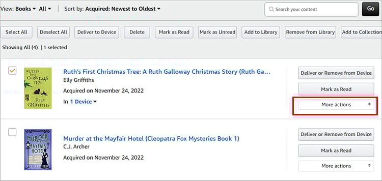 Agora, você pode ver as listas de seus livros comprados. Destaque o livro que deseja adicionar e clique em Mais ações ao lado dele.