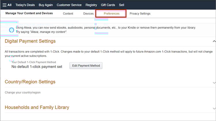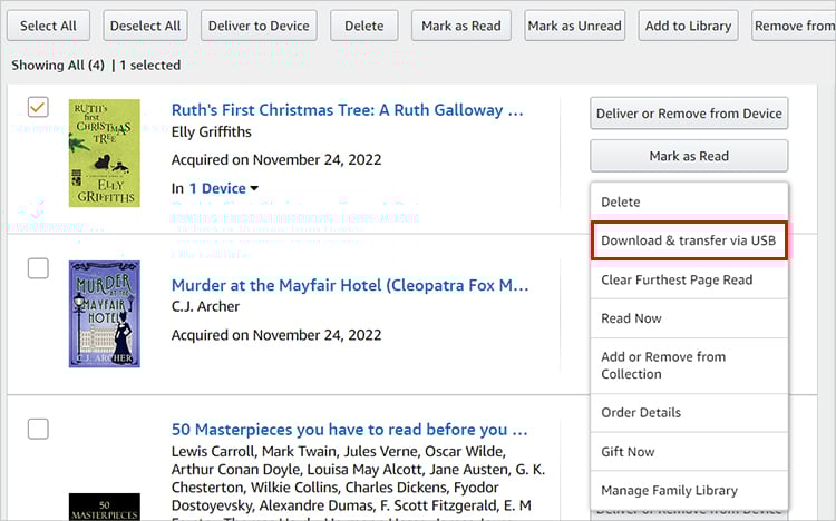 Se você já comprou livros em sua conta da Amazon, pode transferi-los para o Kindle. Você pode encontrar a opção Entregar no menu Seu conteúdo e dispositivos. Em seguida, escolha o seu Kindle.