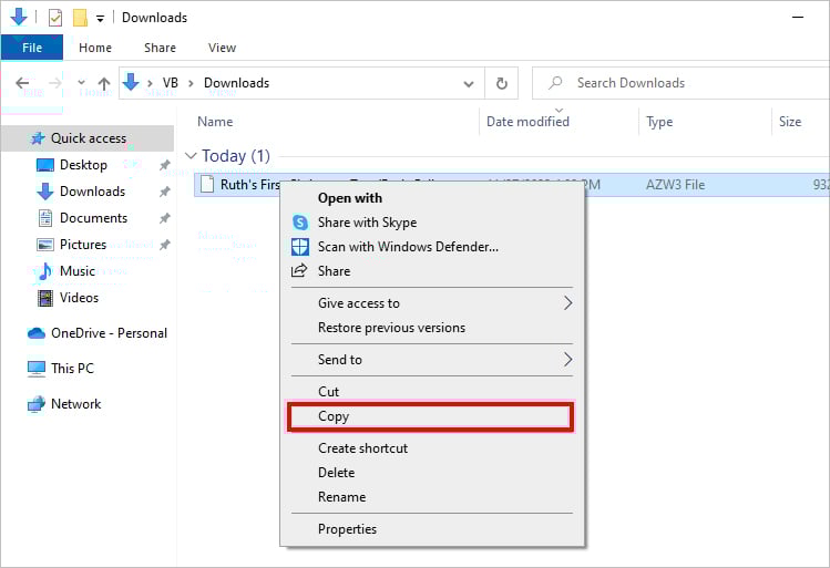 Agora, conecte o USB ao seu Kindle e PC. Em seguida, aguarde o PC reconhecer seu Kindle. No explorador de arquivos, localize Arquivo e clique com o botão direito nele. Escolha Copiar.