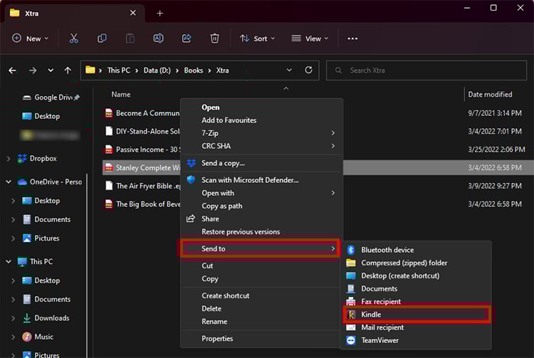 Localize o livro e clique com o botão direito nele. Escolha Enviar para. Clique em Kindle.
