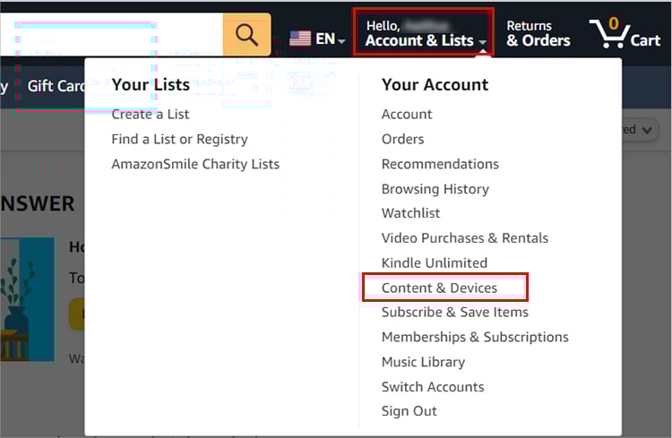 Passe o mouse sobre o menu Contas e listas no canto superior direito. Escolha Conteúdo e dispositivos.