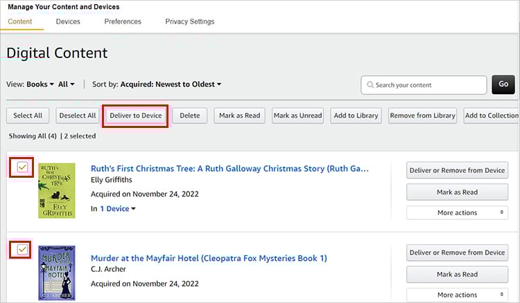 Nas listas, Marque a caixa dos livros que deseja adicionar ao Kindle. Agora, clique no botão Entregar para o dispositivo na parte superior.