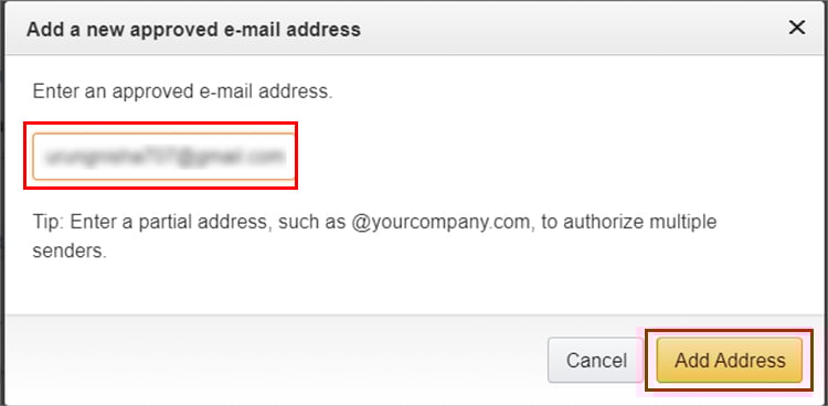 Veja se o seu endereço de e-mail é Appr amei. Caso contrário, clique em Adicionar um novo endereço de e-mail aprovado.