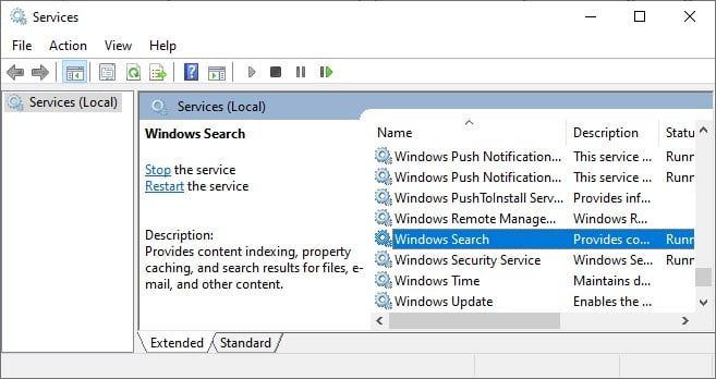 Se você usa o recurso de pesquisa regularmente, pode prosseguir com uma simples reinicialização do serviço em vez de desativá-lo. Uma reinicialização corrigiria o problema se o serviço consumisse uma CPU alta devido a uma interrupção ou congelamento. Para reiniciar o serviço de pesquisa do Windows, você deve primeiro desativá-lo seguindo as mesmas etapas acima.