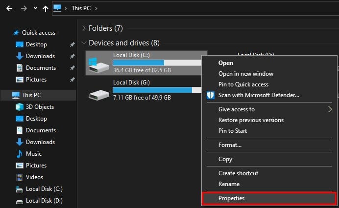 Além disso, se você não quiser um disco específico a ser indexado nos resultados da pesquisa, você também pode fazer isso facilmente. Abra Este PC. Clique com o botão direito do mouse no disco desejado e escolha Propriedades no menu de contexto.