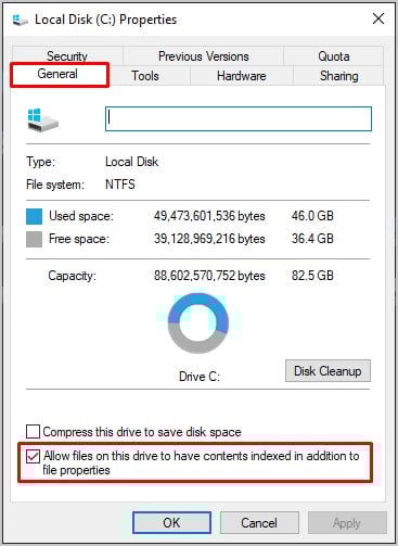 Vá para a guia Geral na janela Propriedades. Em seguida, desmarque a opção Permitir que os arquivos nesta unidade tenham conteúdo indexado além das propriedades do arquivo.