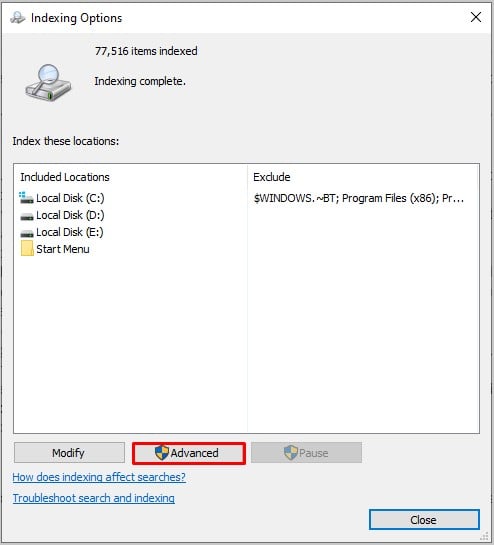 Siga as etapas até a etapa 2 do método acima para abrir as Opções de indexação janela. Depois disso, clique no botão Avançado .
