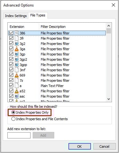 Pule para a guia Tipos de arquivo. Marque a caixa ao lado de Somente propriedades do índice.