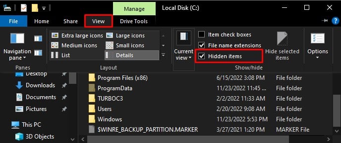 Pressione Windows + E e abra Este PC. Abra Disco Local (C:). Clique em Visualizar > Itens ocultos.