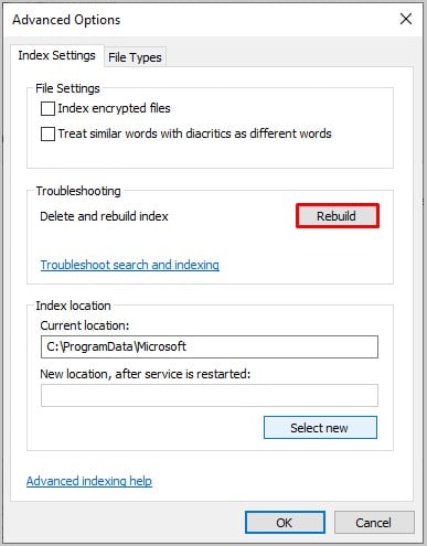 Agora, é hora de recriar o índice. Abra Opções de indexação. Clique em Avançado. Escolha Reconstruir.