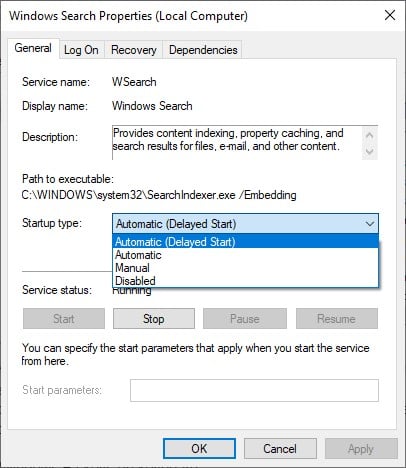 Depois de desativar o serviço de pesquisa e reiniciar o PC, navegue novamente até a Pesquisa do Windows em Serviços aplicativo Agora escolha o Tipo de inicialização para Automático (início atrasado).