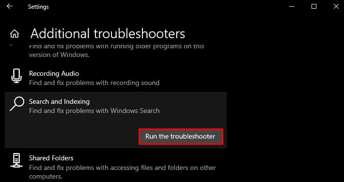 Escolha Pesquisa e indexação. Em seguida, clique no botão Executar a solução de problemas.