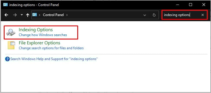 Inicie o Painel de Controle no seu PC. Para iniciá-lo, pressione Windows + R. Em seguida, digite control e pressione a tecla Enter. Agora, na caixa de pesquisa do painel de controle, digite Opções de indexação. Abra-o nos resultados da pesquisa.