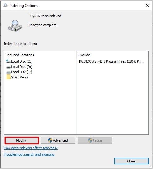 Na nova janela Opções de indexação, clique em Modificar.