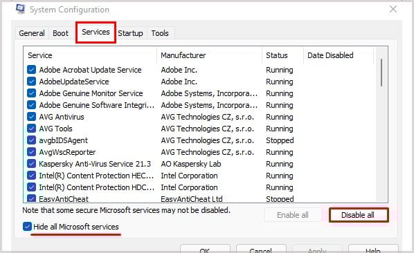 Abra Executar. Digite msconfig e pressione Enter para abrir Configuração do sistema. Vá para a guia Serviços . Marque Ocultar todos os serviços da Microsoft e clique em Desativar todos.