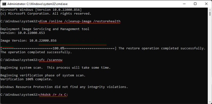 Você pode usar o Deployment Image Servicing and Management (DISM) e o System File Checker (SFC) para reparar arquivos corrompidos arquivos de sistema e a ferramenta de verificação de disco (CHKDSK) para reparar setores de inicialização corrompidos. Para fazer isso,