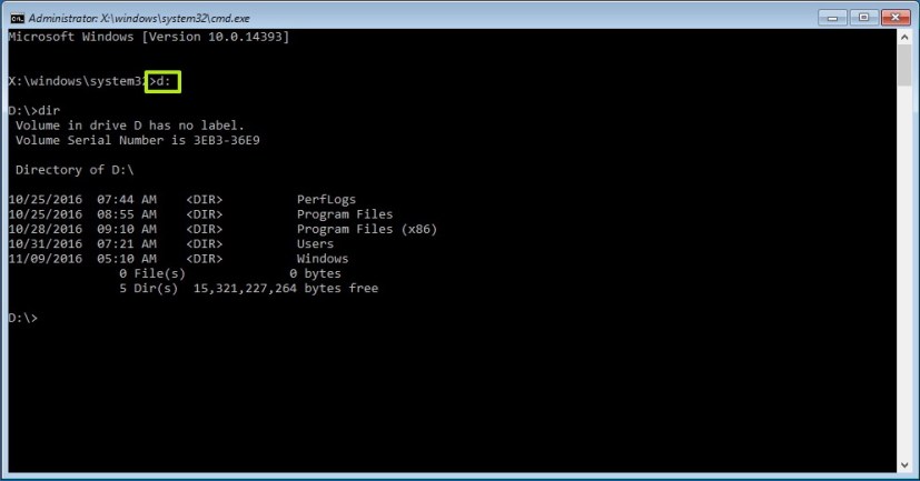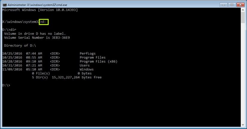 Quando o dispositivo iniciar no prompt de comando, ele iniciará em X:\Windows\System32. Isso significa que você precisará mover para a letra da unidade em que o Windows está instalado. Embora o sistema operacional resida na unidade C:\, essa letra da unidade pode mudar para outra quando você inicializa o computador no modo de recuperação. No entanto, na maioria dos casos, a letra da unidade é D:\. Como resultado, digite o seguinte comando para entrar na unidade correta onde o Windows 10 está instalado e pressione Enter: