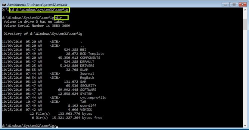 Aviso: Após executar o comando dir, o tamanho do arquivo (SISTEMA, SOFTWARE, SAM, SEGURANÇA, PADRÃO) deve ser semelhante ao da captura de tela. Se algum dos arquivos mostrar 0, NÃO continue, pois você não poderá reparar a instalação do Windows 10 e seu dispositivo pode parar de inicializar.