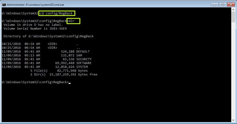 Digite o seguinte comando para confirmar o conteúdo da pasta RegBack e pressione Enter: