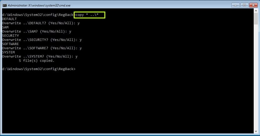 Digite o seguinte comando para copiar os arquivos da pasta RegBack para a pasta config, restaure o Registro do Windows 10 e pressione Enter e a tecla Y em cada pergunta para confirmar: