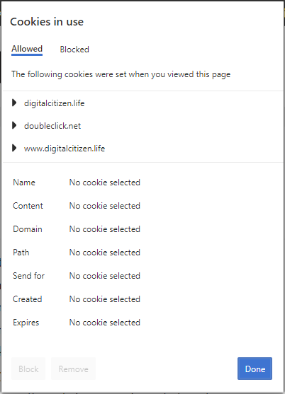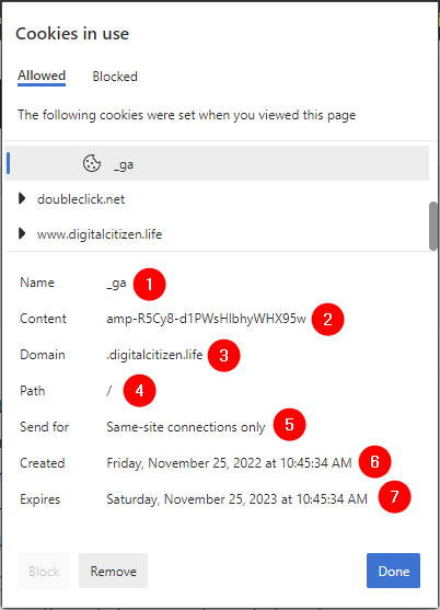 Todos os navegadores modernos suportam cookies, e eles têm um tamanho pequeno de menos de 4 KB. Para ajudar você a entender a estrutura de um cookie, vamos usar como exemplo o cookie”_ga”enviado pelo nosso site, Digital Citizen, e usado para estatísticas pelo Google Analytics. Eu o analisei usando o Microsoft Edge.