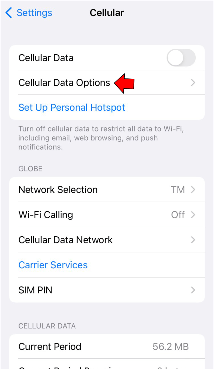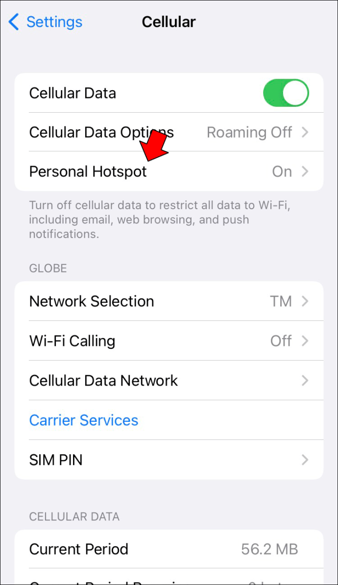 O”Pouco de dados”recurso ajuda a economizar dados de celular. Quando o modo Low Data estiver ativado, ele interromperá as tarefas em segundo plano e outros recursos, incluindo o ponto de acesso. Siga estas etapas para desativá-lo no seu iPhone: