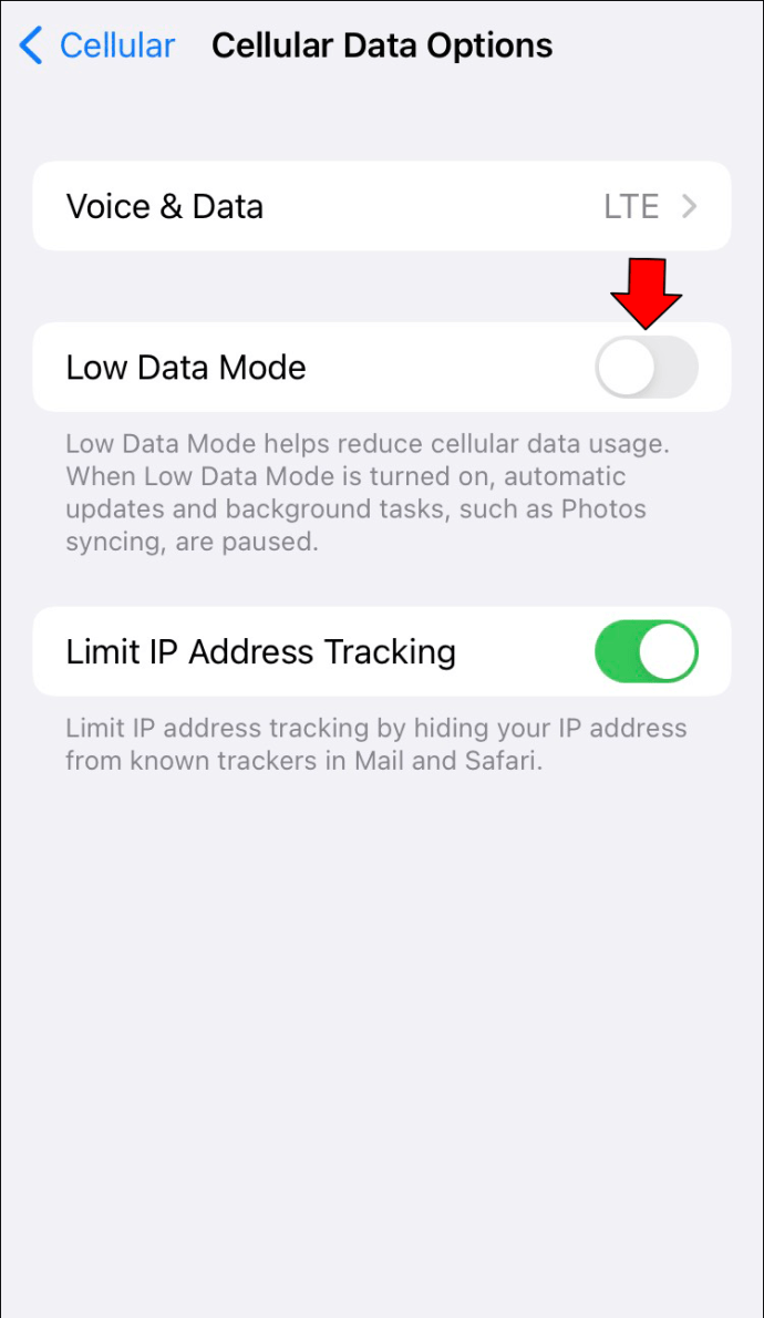 Certifique-se de que o botão de alternância”Low Data Mode”esteja desativado.