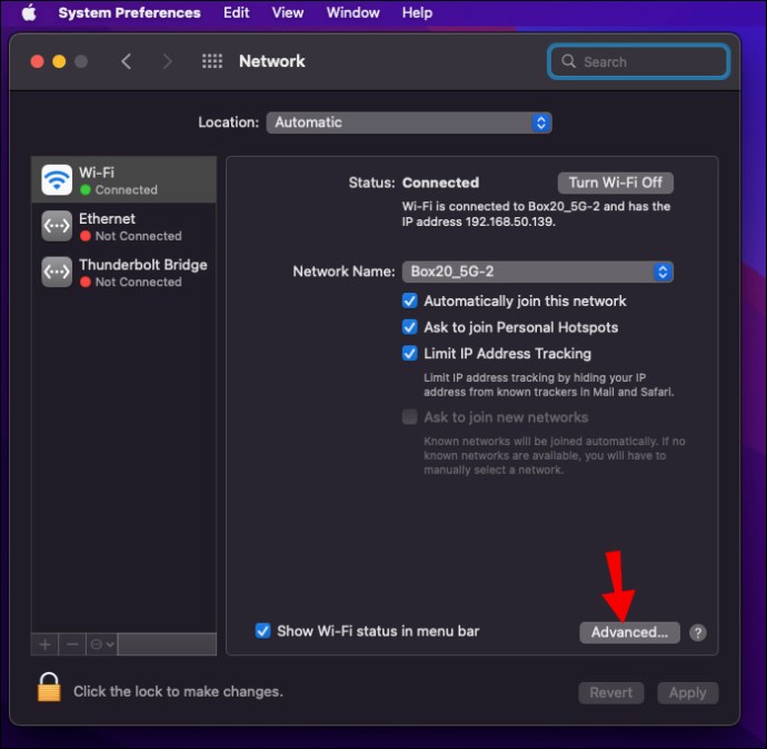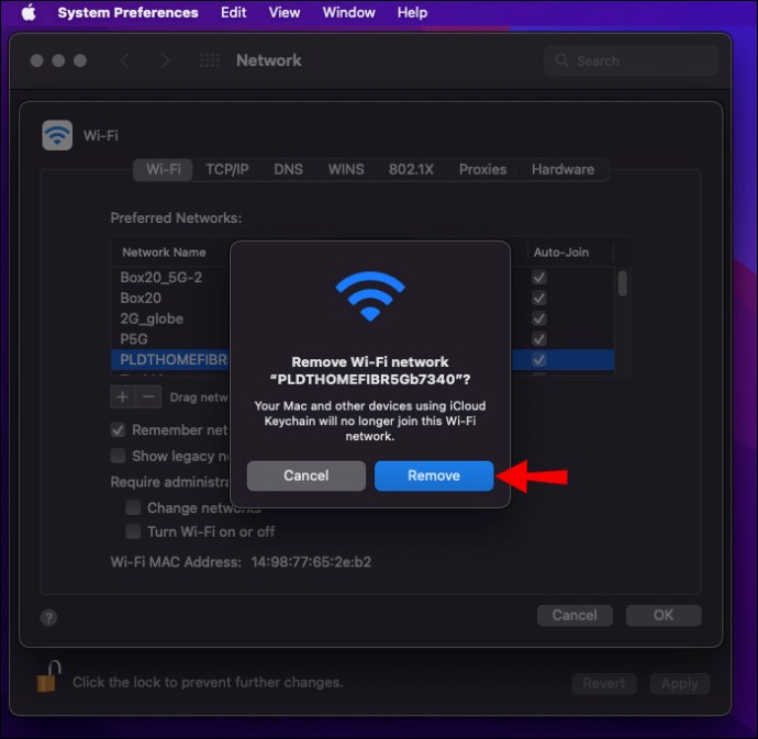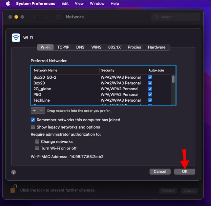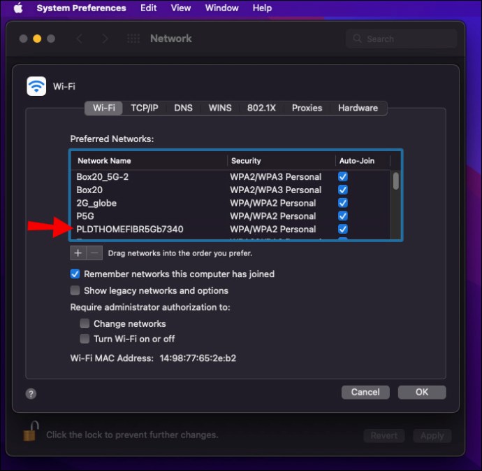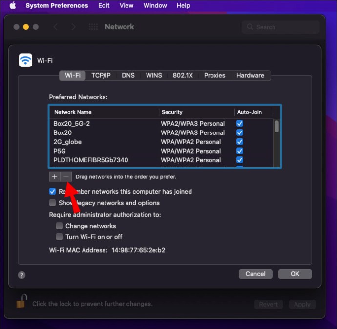 A janela Wi-Fi exibirá uma lista de”Redes preferidas”. Clique no ponto de acesso que você deseja que seu Mac esqueça por enquanto.