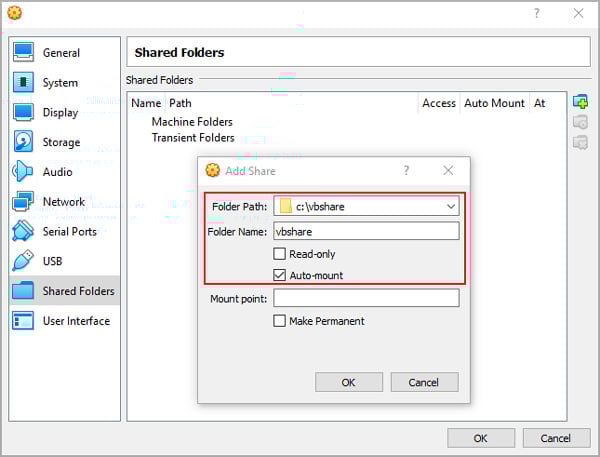 VirtualBox permite criar pastas compartilhadas sem ter que alterar manualmente as permissões das pastas. Você ainda tem a opção de montar automaticamente essas pastas para facilitar o acesso. Aqui está o que você precisa fazer para criá-los: