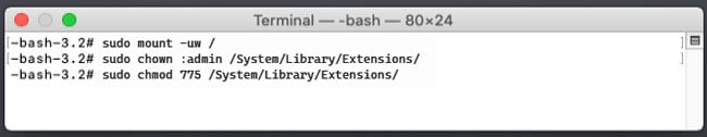 Depois disso, abra o Terminal novamente e digite os comandos abaixo: sudo mount-uw/sudo chown:admin/System/Library/Extensions/sudo chmod 775/System/Library/Extensions/
